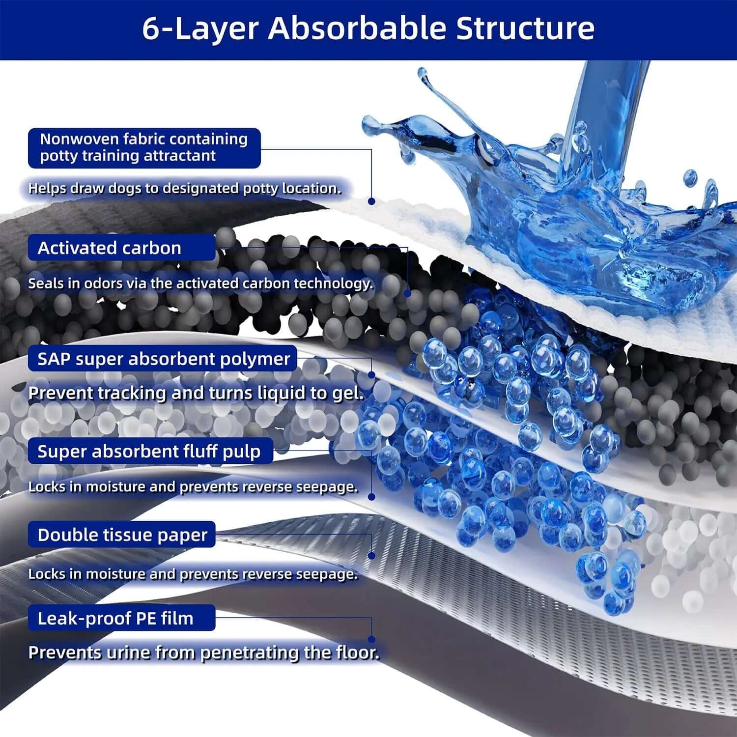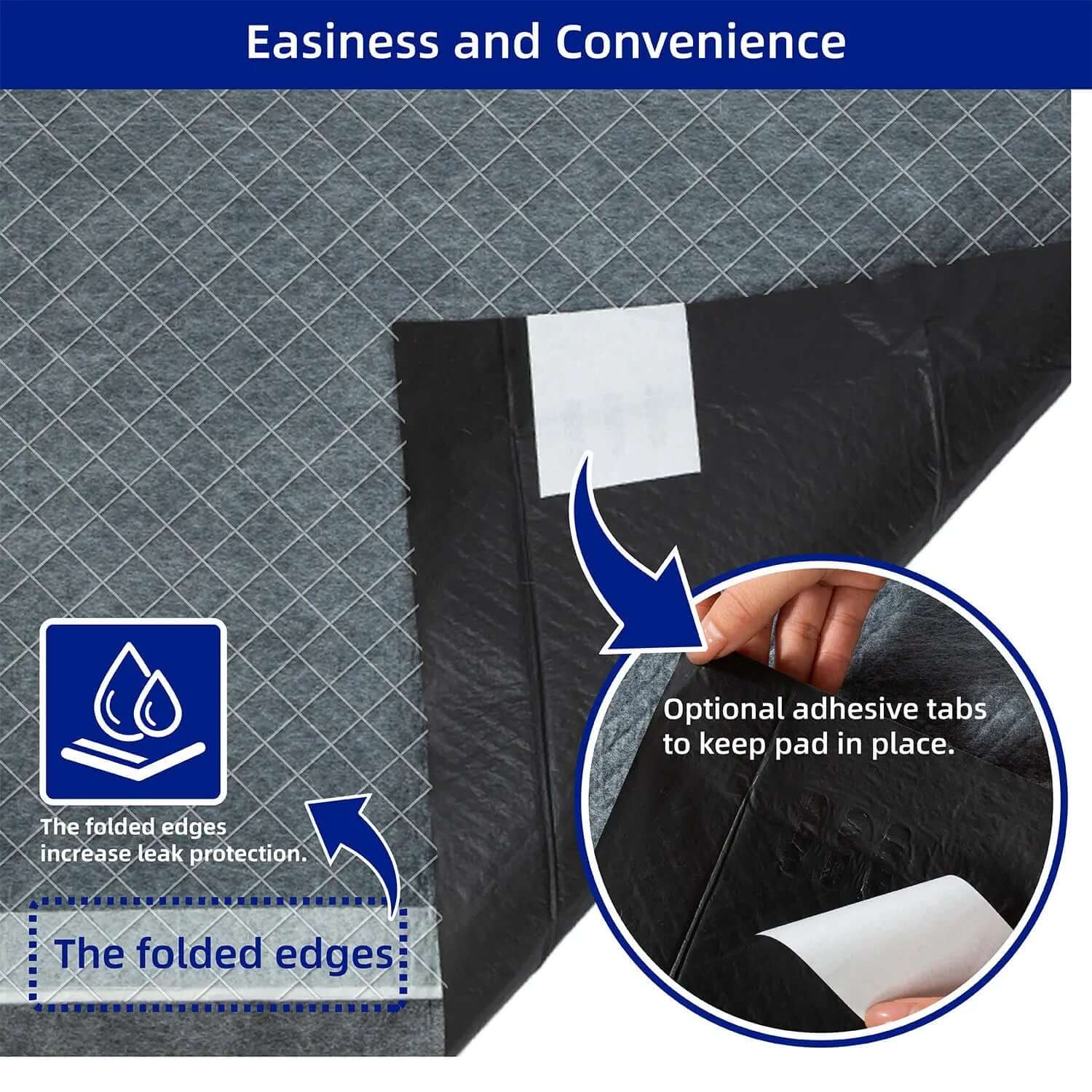 Each pad features a multi-layer absorbent core that quickly soaks up liquid while trapping unpleasant odors. The bamboo charcoal layer works to neutralize smells, while the PE waterproof bottom film prevents leaks from reaching floors or carpets. This advanced construction makes these Disposable Puppy Pads with Odor Control ideal for housebreaking puppies, supporting senior dogs, and managing indoor pet needs.